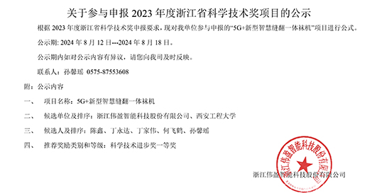 根據(jù) 2023 年度浙江省科學(xué)技術(shù)獎申報要求,現(xiàn)對我單位參與申報的“5G+新型智慧縫翻一體襪機(jī)”項(xiàng)目進(jìn)行公式。